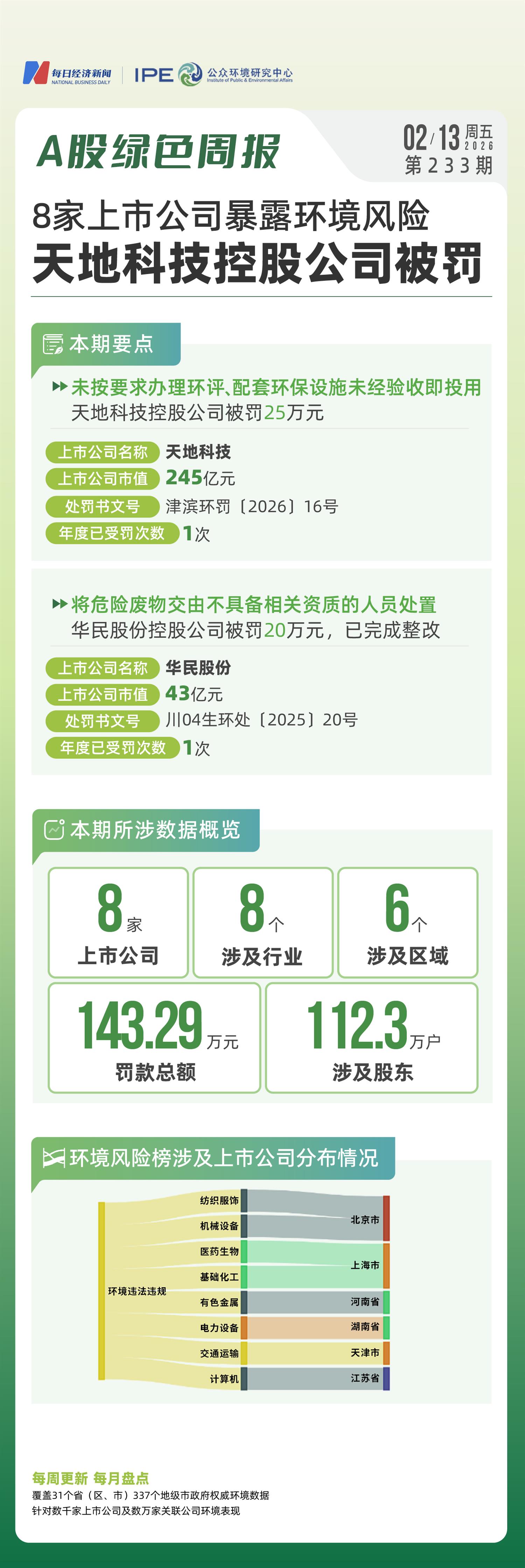 未按要求办理环评以及环保设施未经验收即投入使用,天地科技(SH600582)控股公司被罚25万元;将危险废物交由不具备相关资质的人员处置,华民股份(SZ300345)控股公司收到20万元罚单?? 2026年2月第二周,哪些上市公司的环境保护与信披责任亮起了红灯?且看A股绿色周报第233期。